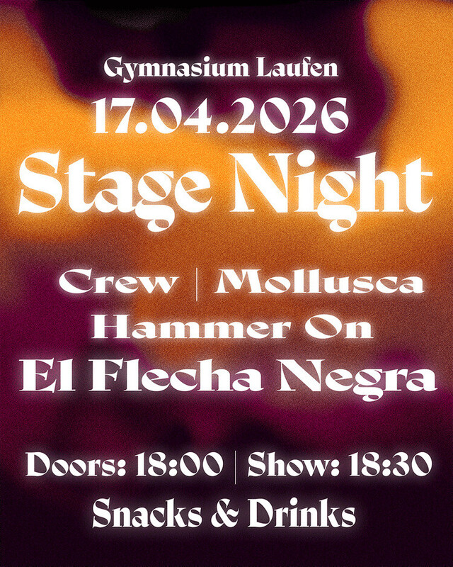 Mit El Flecha Negra (einziges CH-Konzert), Hammer-On zurück vor Heimpublikum sowie Mollusca & Crew – ein Abend voller Energie und Live-Sound. Ein Abend, der Laufen zum Beben bringt: Die Stage Night 2026 vereint internationale Energie mit lokalen Legenden. Headliner ist El Flecha Negra – die gefeierte Cumbia-Band aus Freiburg. Dauernd auf Tour, international gefragt – und 2026 nur ein einziges Mal in der Schweiz live zu erleben: in Laufen. Dazu kommen Hammer-On – die lokalen Helden, die nach Jahren endlich wieder vor ihrem Heimpublikum stehen. Mit ihrem progressiven Rock bringen sie das Tal zum Beben und liefern genau den Moment, auf den viele gewartet haben. Ergänzt wird das Line-up durch Mollusca und Crew, die den Abend mit frischen Sounds und purer Live-Energie komplett machen. Ein Abend. Eine Bühne. Eine seltene Chance. Wenn du dabei bist, weißt du warum. https://www.instagram.com/stagenight_official/