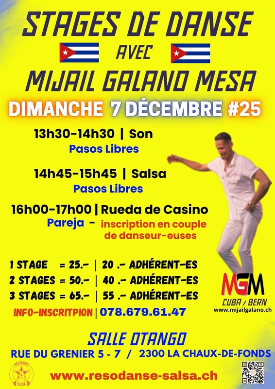 Stages de Danse Cubaine 💯🇨🇺✨ Dimanche 7 décembre 2025 Avec le Maestro Mijail Galano Mesa (Cuba/Bern) Venez passer un magnifique après-midi, développer votre connaissance et passion de la danse 💃🕺Grâce à l'énergie et la pédagogie de notre incroyable Maestro Cubano Pour femmes et hommes, venez danser 🎶🪇 🔹13h30 - 14h30 SON Cubano - pasos libres (pas en solo) 🔹14h45 - 15h45 SALSA Cubana - pasos libres (pas en solo) 🔹16h00 - 17h00 RUEDA DE CASINO INSCRIPTION en couple de danseur-euses. Si vous n'avez pas de partenaire contactez moi rapidement. Je tiens une liste et vous trouve un-e binôme. ⚠️ Priorité aux premièr-es inscrit-es. Info et inscription auprès de Tommaso Lafranchi 📞 078.679.61.47 Tarifs stages : - 1 stage 25 frs / 20 frs adhérent-es Resodanse - 2 stages 50 frs / 40 frs adhérent-es Resodanse - 3 stages 65 frs / 55 frs adhérent-es Resodanse 📍Salle de danse OTANGO Rue du grenier 5 - 7 2300 La Chaux-de-Fonds www.resodanse-salsa.ch