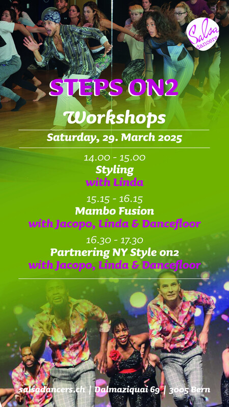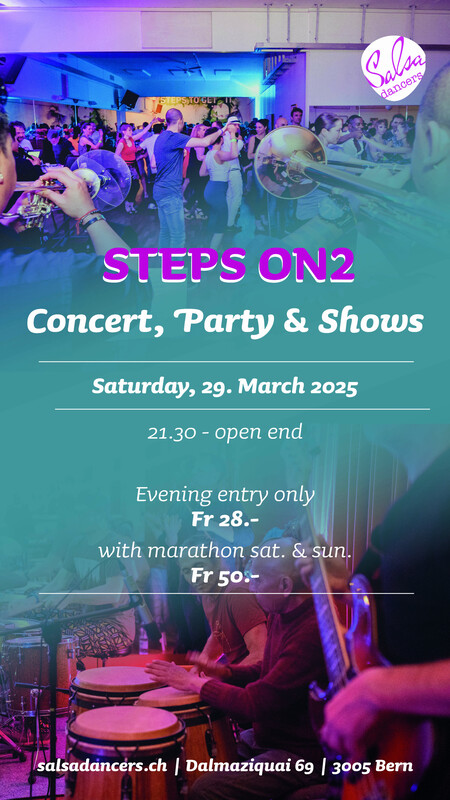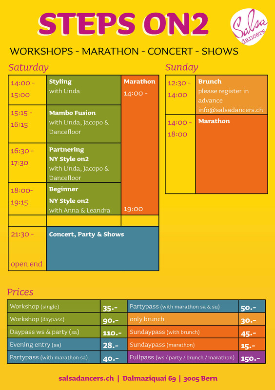 WORKSHOPS - MARATHON - CONCERT - SHOWS Saturday Workshops: 14:00 -15:00 Mambo Fusion & Shines with Linda, Jacopo & Dancefloor 15:15 -16:15 Cha-cha-cha Fusion with Linda, Jacopo &Dancefloor 16:30 -17:30 Partnering NY Style on2 with Linda, Jacopo & Dancefloor 18:00 - 19:15 Beginner NY Style on2 wirth Anna & Leandra 14:00 - 19:00 Marathon 21:00 -open end Conzert / Party & Shows Sunday: Brunch (please register in advance) info@salsadancers.ch 14:00 - 18:00 Salsa Marathon Prices: Workshop (single) 35.- Partypass (with marathon sa & su) 50.- Workshop (daypass) 90.- only brunch 30.- Daypass ws & party (sa) 110.- Sundaypass (with brunch) 45•- Evening entry (sa) 28.- Sundaypass (marathon) 15・- Partypass (with marathon sa) 40.- Fullpass (ws / party / brunch / marathon) 150.-
