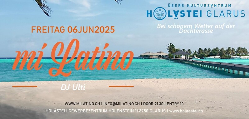 Holaaaaa Wir freuen uns, gemeinsam mit Euch die nächste miLatino Party im Holästei Glarus zu feiern. Türöffnung ist Heute Freitag 06.06. um 21.30 Uhr. Die Party findet im Holästei Glarus statt. Bei schönem Wetter findet die Veranstaltung über den Dächern von Glarus und Ennenda statt, auf der Dachterasse. Der Flyer darf natürlich auch gerne über die sozialen Medien geteilt werden. Wir freuen uns auf dich und deine Freunde dein miLatino-Team www.milatino.ch