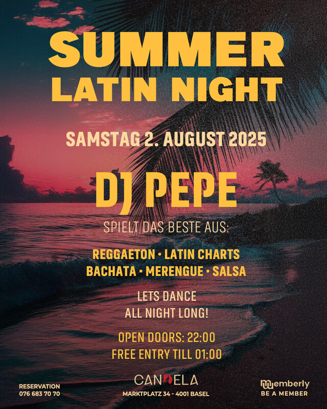 🎉 Summer Latin Night 🎉 🔥 Heisse Rhythmen – Coole Drinks – Tropisches Flair 🔥 📅 Samstag, 2. August 2025 📍 Candela Club Basel, Marktplatz 34, Basel 🕗 Ab 22:00 Uhr 🎧 DJ Pepe spielt das Beste aus: Salsa – Reggaeton – Latin Charts – Merengue House – Bachata 🕑 Von 22:00 bis 00:00 Uhr: Schwerpunkt auf Salsa & Bachata 🕒 Ab 00:00 Uhr: Latinmix-Party pur! 💃 Let’s dance all night long! 🕺 💥 Eintritt frei bis 1:00 Uhr! 💥