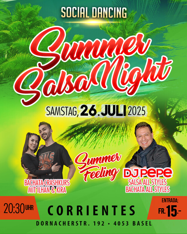 🌞 SUMMER SALSA NIGHT 🌴 Tanzen. Fühlen. Feiern. Erleben Sie eine unvergessliche Sommernacht voller Salsa- und Bachata-Magie im Corrientes Basel! 🕢 Ab 20:30 Uhr starten wir mit einem mitreissenden Bachata-Workshop mit Kira & Ilhan – perfekt für Einsteiger*innen und Fortgeschrittene. Im Eintritt inklusive! 🎶 Danach heisst es: Social Dancing non-stop! Ob Salsa All Styles oder Bachata All Styles – die Tanzfläche gehört euch! 💃 HASTA LA PISTA, BABYS! 🕺 🎟️ Eintritt: CHF 15.– 📍 Corrientes Basel Dornacherstrasse 192, 4053 Basel