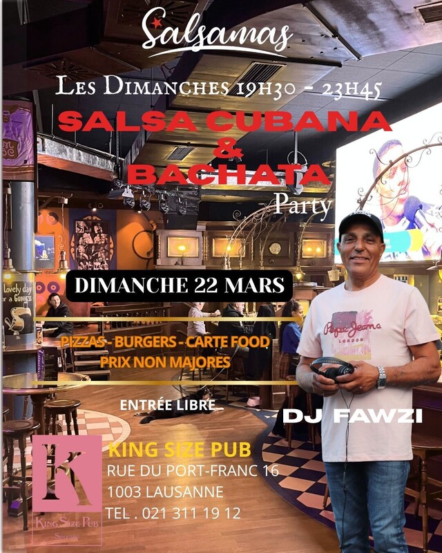 🔥 Le plus grand pub de Suisse romande ! 📍 Au cœur de Lausanne – Quartier du Flon ➡️ À côté du cinéma Pathé | En face du MAD 🍔 FOOD | 🍹 DRINK | 🎶 MUSIC | 🎉 PARTY ⸻ 💃 Soirée Salsa Cubana & Bachata 🎧 DJ Fawzi en live ! 📅 Tous les dimanches 🕗 19h30 – 23h45 📍 King Size Pub 📨 Rue du Port-Franc 16, 1003 Lausanne Entrée libre 📌 DJ susceptible de changer selon disponibilité ✨ Viens danser, boire, manger et partager de bonnes vibes ! https://www.facebook.com/events/1807266093296374