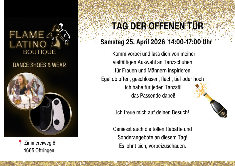 Komm vorbei und lass dich von meiner vielfältigen Auswahl an Tanzschuhen für Frauen und Männern inspirieren. Egal ob offen, geschlossen, flach, tief oder hoch ich habe für jeden Tanzstil das Passende dabei! Ich freue mich auf deinen Besuch! Geniesst auch die tollen Rabatte und Sonderangebote an diesem Tag! Es lohnt sich, vorbeizuschauen. ZEIT: 14:00-17:00 Uhr https://flamelatino.ch/ https://flamelatino.ch/