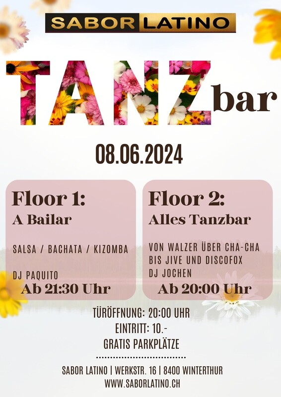Tanzbar, Tanzbar, die Party für alle Freunde der Tanzmusik, von Salsa, Bachata, Kizomba, Discoswing, Rumba, Walzer, Jive, Tango und mehr. Auf 2 Dancefloors legen legen die DJ`s die beste auf. In den Lounge kann man sich zwischendurch mit einem unserer feinen Cocktails entspannen und für neue Tänze aufladen. Salsafloor: DJ Paquito Standardfloor: Jochen