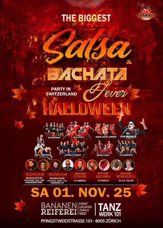 THE BIGGEST SALSA AND BACHATA FEVER 🎃 HALLOWEEN 🎃 PARTY IN SWITZERLAND Samstag 25. OKTOBER 2025 Bananenreiferei & Tanzwer 101 Zürich 🎃🎃🎃 ● AB 22 JAHREN ● 2 GROSSE CLUBS ● 5 DANCE FLOORS ● TICKETS ABENDKASSE ● DOORS: 21:30 – 04:00 UHR ● 7 TOP SALSA, BACHATA, CUBA, KIZOMBA DJS ● TOP NATIONAL PREMIER SHOWS ● EINTRITT: BEZAHLUNG AN DER KASSE NUR BARGELD. ● GETRÄNKE-BAR: BARGELD & CREDITCARD. ● 2 GRATIS GARDEROBE ● 2 HAUPTEINGÄNGE ● 300 AUTO PARKPLÄTZE ● HALLOWEEN DEKORATIONEN 🎃🎃🎃 Herzlich willkommen zur GRÖSSTEN SALSA & BACHATA Halloween Party der Schweiz. Einmal mehr heissen wir HALLOWEEN 2025 willkommen, ein spezielles Datum und die meist erwartete Party, sie bringt uns viele Überraschungen mit vielen Kreationen der erkleidungen und Schminke. Eine spektakuläre Nacht der Hexen, Sie kommen in Ihrer besten Kreation, gruseliger Schminke und Kostüm. Ohne Zweifel, SALSA HALLOWEEN wird eine unvergessliche Party, Horror und wo alle viel Spass haben werden. Herzlichen Dank an unser tolles Publikum, dass Ihr uns immer die Energie gibt, Freundschaft, Vertrauen und Liebe. 🎃🎃🎃 WORKSHOP PLAN AB 2030 UHR ● 20:30 bis 21:30 Uhr Tanzwerk 101 ● ARTIST: Alma & Luis von BACHASUAVE ● STYLE: Bachata Flow ● LAVEL: Intermediate ●●●● ● 20:30 bis 21:30 Uhr Bananenreiferei ● ARTIST: Reem von UDance ● STYLE: Bachata Lady Style ● LAVEL: Intermediate **** Sie brauchen nicht zu buchen, kommen Sie direkt zum Club Bananenreiferei am Samstag 01. November um 19:15 Uhr. Der Workshop Preis ist CHF 30.- Inkl. Garderobe & Party. 🎃🎃🎃 ● SHOWS 00:00 Uhr IN BANANENREIFEREI ● MC: LUIZ VAZQUEZ ● GUEST SHOW: by ● SHOW: by BAILA RICO Ladies Premier. ● SHOW: by SALSA PEOPLE - Premier ● SHOW: by NL DANCE SEMI-PRO by NATALIA LOPEZ ● SHOW: by WUALESKA Premier ● SHOW: by BONGO DANCE COMPANY ● SHOW: by KIKO & CRISTINA ● SHOW: by LAS ARDIENTES by ANDREA GABRIELA-Show Champaña 🎃🎃🎃 Während der Shows wird die Musik im anderen Dance Floor nicht aufhören, sondern ohne Pause weiterlaufen. 🎃🎃🎃 MAIN FLOOR: SALSA ALLSTYLES>> BANANENREIFEREI >> 368 m² Dance Floor DJ SAMY DJ RAFA DJ GIOVANNI Salsa Allstyles - Clasica – Puertorriqueña - Salsa Pal Bailador. 🎃🎃🎃 MAIN FLOOR: BACHATA FEVER>> TANZWER 101 >> 371 m² Dance Floor DJ KAHLID DJ DESEA DJ LUJO 100% Bachata Fusion, Sensual, Moderna, Clasica, del Recuerdo 🎃🎃🎃 3RD FLOOR CUBANO>> (Bananenreiferei) DJ INMENSO 100% Salsa Cubana / Timba / Cubaton / Fiesta 🎃🎃🎃 4th FLOOR: KIZOMBA>> (Bananenreiferei) DJ DERECK Kizomba Semba Tarraxinha Urban Kiz 🎃🎃🎃 5th FLOOR: ROMANTICA>> (Bananenreiferei) DJ U.S. THALER 🎃🎃🎃 AUF DEM DACH DER BANANENREIFEREI & TANZWERK 101 HABEN WIR PARKPLÄTZE FÜR 400 AUTOS. 🎃🎃🎃 Eintritt CHF 25.- Inkl. 5 Dance Floors & 2 Garderobe Gratis 🎃🎃🎃 ✯ Du kannst Dein SPECIAL TICKET in Deiner Tanzschule oder bei Salsa, Bachata, Kizomba, Zouk, DJs & Partners bestellen, es in Deinem Handy aufbewahren, an der Kasse vorzeigen und Du erhältst einen Rabatt von CHF 5.- 🎃🎃🎃 2 EINGÄNGE UND KASSEN: 1. BEI BANANENREIFEREI: KASSE UND GARDEROBE, Sie können durch die Bananenreiferei eintreten, dort haben wir eine Kasse und Garderobe. 2. BEIM TANZWERK 101: KASSE UND GARDEROBE, Sie können über das Tanzwerk 101 eintreten, dort haben wir eine Kasse und Garderobe. 🎃🎃🎃 LOCATION: BANANENREIFEREI & TANZWERK 101 Pfingstweidstrasse 101 8005 Zürich 🎃🎃🎃 SEARCH MAP https://search.ch/.../Bananenreiferei,Z%C3%BCrich... 🎃🎃🎃 Beinvenidos Juanes Events
