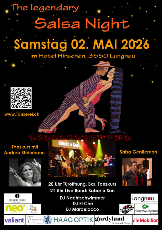 Der grosse Bruder des Elite-Salsa in Langnau ist wieder da, und wie immer mit einem Leckerbissen der besonderen Art: Die Salsa-Band: Sabor a Son! Der Bandname "Sabor a Son" - was so viel bedeutet, wie das Erkunden und Erfahren dieses kubanischen Musikstils - steht denn auch dafür, das entsprechende Lebensgefühl, die Leidenschaft und den Tanz auf das Publikum zu übertragen. Das Repertoire der inzwischen zehnköpfigen Formation umfasst neben traditionellerem Son auch moderne Stile wie Salsa und weitere verwandte Richtungen. https://www.saborason.com DJ Nachtschwimmer, El Ché, und Marcelocco heizen zusätzlich den Salseras und Salseros aller Niveaus kräftig ein. Salsa Gentlemen® vor Ort: Unsere Salsa-Gentlemen begleiten allein gekommene Ladies auf‘s Parkett. Für Abwechslung und genug Platz zum Tanzen im Hirschensaal ist gesorgt. Bei der Türöffnung um 20:00 Uhr steht unser Bar Team mit leckeren Drinks für Sie bereit. Ca. 20:15 Uhr startet der Tanzkurs für Einsteiger mit Andrea Steinmann anschliessend Konzert/Disco mit Band und DJ‘s, bis die Schuhe glühen ;-) Anreise mit Bahn: bis Bahnhof Langnau im Emmental, anschl. 5 Min. Fussweg bis Hotel Hirschen, Dorfstrasse 17, 3550 Langnau. Special: Essen à la Carte www.hirschen-langnau.ch und anschliessend Tanzkurs und Tanzen zu Live Musik und DJ‘s https://taenzerei.ch/the-legendary-salsa-night