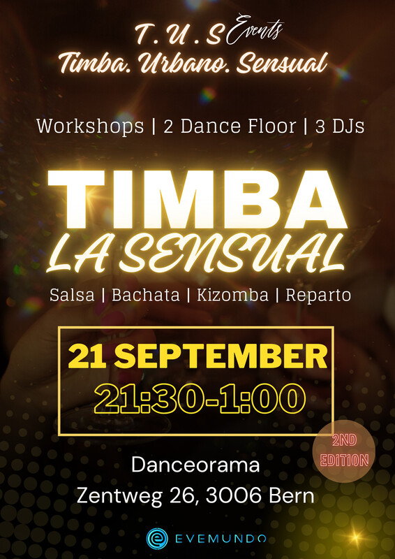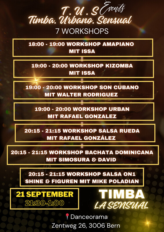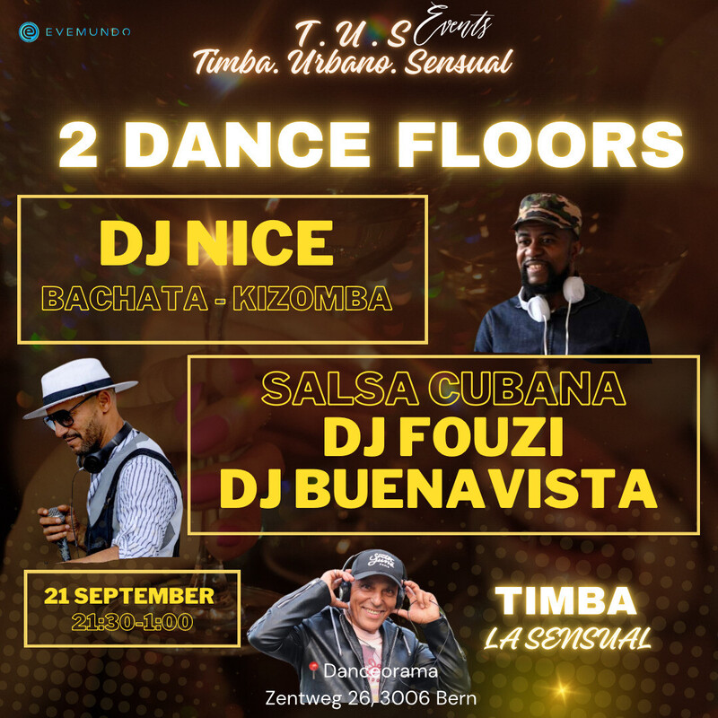 🇪🇸: Llegó lo que tu querías: Bachata y Timba por igual! 2 Salas! 3Djs 🎧 ⠀ T.U.S Events presenta: Timba la Sensual 🎉 La noche de Timba y Sensualidad que te faltaba en Berna ⠀ Una noche de calor 🔥 y alegría, con una dosis de sensualidad ***************************** Salsa | Bachata | Kizomba | Urbano 21.09.2024 ⠀ 📍: Danceorama Zentweg 26, 3006, Bern ***************************** Qué te espera? 6 Workshops de 1 hora cada uno: * Son Cubano * Rueda de Casino * Bachata Dominicana * Urban Fusión * Kizomba * Salsa On1 ⠀ 2 salas de baile | 3 DJs | Shows ***************************** Programa 18:00 - Apertura de puertas WORKSHOPS: SALA Timba • 19:00 - 20:00 - Workshop de Son Cubano/All Level/ Walter Rodríguez 🇨🇺 ⠀ • 20:15 - 21:15 - Workshop de salsa Rueda/ Advanced/ Rafael Gónzalez 🇨🇺 ⠀ SALA Sensual • 19:00 - 20:00 - Workshop de Kizomba/ All Level/ Issa 🇨🇬 ⠀ • 20:15 - 21:15 - Workshop de Bachata Dominicana/ All Level/ Simosura🇮🇹 & David🇪🇨 ⠀ SALA Urbana • 19:00 - 20:00 - Workshop de Urban Fusión/ All Level / Rafael Gónzalez 🇨🇺 ⠀ • 20:15 - 21:15 - Workshop de Salsa On1 Shine & Figuren/ All Level / Mike Poladian 🇱🇧 ⠀ Precio x Workshop: 25 CHF ***************************** FIESTA 🥳 de 21:30 -01:00 ⠀ • SALA Timba: Salsa cubana/ DJ Buenavista & Dj Fouzi • SALA Sensual: Bachata y Kizomba/ DJ NICE ____________ Show : Ifarará Show Case : Claudio Disla ***************************** Entrada: 15 CHF 1 Workshop + Entrada: 35 CHF Full Pass: 50 CHF ***************************** Info : 078.795.39.88 🇩🇪: Was ihr euch gewünscht habt, ist da: Bachata und Timba gleichermaßen! 2 Räume! 3 Djs 🎧 ⠀ T.U.S Events präsentiert: Timba la Sensual 🎉 Die Nacht der Timba und der Sinnlichkeit, die dir in Bern gefehlt hat. ⠀ Eine Nacht voller Hitze 🔥 und Freude, mit einer Portion Sinnlichkeit. ***************************** Salsa | Bachata | Kizomba | Urbano ⠀ 21.09.2024 ⠀ 📍: Danceorama Zentweg 26, 3006, Bern ***************************** Was erwartet dich? 6 Workshops zu je 1 Stunde: * Son Cubano * Rueda de Casino * Bachata Dominicana * Urban Fusión * Kizomba * Salsa On1 2 Tanzsäle | 3 DJs | Shows ***************************** Programm 18:00 - Öffnung der Türen ⠀ WORKSHOPS: RAUM: Timba • 19:00 - 20:00 - Workshop Son Cubano/All Level/ Walter Rodríguez 🇨🇺 ⠀ • 20:15 - 21:15 - Workshop de salsa Rueda/ Advanced/ Rafael Gónzalez 🇨🇺 ⠀ RAUM: Sensual • 19:00 - 20:00 - Workshop Kizomba/ All Level/ Issa 🇨🇬 ⠀ • 20:15 - 21:15 - Workshop de Bachata Dominicana/ All Level/ Simosura🇮🇹 & David🇪🇨 ⠀ RAUM: Urbano • 19:00 - 20:00 - Workshop de Urban Fusión/ All Level / Rafael Gónzalez 🇨🇺 ⠀ • 20:15 - 21:15 - Workshop de Salsa On1 Shine & Figuren/ All Level / Mike Poladian 🇱🇧 ⠀ Preis x Workshop: 25 CHF ***************************** PARTY 🥳 von 21:30 -01:00 ⠀ • SALA Timba: Kubanischer Salsa/ DJ Buenavista & Dj Fouzi • SALA Sensual: Bachata und Kizomba/ DJ NICE ____________ Show : Ifarará Show Case : Claudio Disla ***************************** Eintritt: 15 CHF 1 Workshop + Eintritt : 35 CHF Voller Pass: 50 CHF ***************************** Infos: 078.795.39.88 🇫🇷: Ce que vous vouliez est arrivé : Bachata et Timba à part égale ! 2 salles ! 3Djs 🎧 ⠀ T.U.S Events présente : Timba la Sensual 🎉 La nuit de la Timba et de la Sensualité qui vous manquait à Berne. ⠀ Une nuit de chaleur 🔥 et de joie, avec une dose de sensualité. ***************************** Salsa | Bachata | Kizomba | Urban 21.09.2024 ⠀ 📍 : Danceorama Zentweg 26, 3006, Bern ***************************** Qu'est-ce qui vous attend ? 6 Workshops d'une heure chacun : * Son Cubano * Rueda de Casino * Bachata Dominicana * Urban Fusión * Kizomba * Salsa On1 2 salles de danse | 3 DJs | Shows ***************************** Programme 18:00 - Ouverture des portes ⠀ WORKSHOPS : ⠀ Salle Timba • 19:00 - 20:00 - Workshop de Son Cubano/All Level/ Walter Rodríguez 🇨🇺 ⠀ • 20:15 - 21:15 - Workshop de salsa Rueda/ Advanced/ Rafael Gónzalez 🇨🇺 ⠀ Salle sensuelle • 19:00 - 20:00 - Workshop de Kizomba/ All Level/ Issa 🇨🇬 ⠀ • 20:15 - 21:15 - Workshop de Bachata Dominicana/ All Level/ Simosura🇮🇹 & David🇪🇨 ⠀ Salle Urbaine • 19:00 - 20:00 - Workshop de Urban Fusión/ All Level / Rafael Gónzalez 🇨🇺 ⠀ • 20:15 - 21:15 - Workshop de Salsa On1 Shine & Figuren/ All Level / Mike Poladian 🇱🇧 ⠀ Prix par Workshop: 25 CHF ***************************** PARTY 🥳 de 21:30 -01:00 ⠀ • SALLE Timba : Salsa cubaine/ DJ Buenavista & Dj Fouzi • SALLE Sensual : Bachata et Kizomba/ DJ NICE ____________ Show : Ifarará Show Case : Claudio Disla ***************************** Entrée : 15 CHF 1 Workshop + entrée : 35CHF Pass complet : 50 CHF ***************************** Info : 078.795.39.88