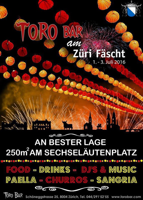 Toro Bar am Züri Fäscht Die Toro Bar ist wieder am Züri Fäscht dabei. Direkt am Sechseläutenplatz erwarten Dich auf 250m2: Drinks, Sangria, Paella, Churros, coole DJ’s und eine feurige Party bis 5:00 Uhr morgens bei der getanzt, gelacht und gefeiert wird. Züri Fäscht Olé!!! Toro Bar Schöneggstrasse 25 8004 Zürich Tel.: 044 291 52 55 info@torobar.com