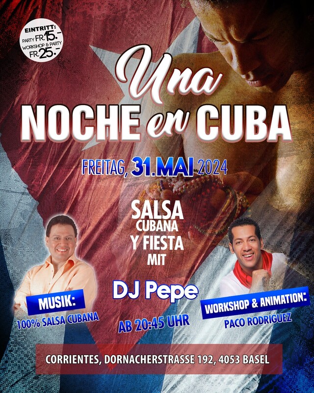 ¡Una Noche en Cuba! Freitag, 31. Mai 2024 Seid bereit für eine heisse Fiesta, direkt hier im Corrientes, Basel! Wir bringen euch kubanische Stimmung pur. 🎶 100% Música Cubana Unsere Tanzfläche wird zum Schauplatz der besten kubanischen Hits aller Zeiten! Von Timba bis Son, von Rumba bis Reggaeton - lasst euch von den mitreissenden Rhythmen entführen. 🎧 DJ Pepe 🎧 Lasst euch von den heissesten Tracks von DJ Pepe mitreissen! Er bringt euch die authentischsten Klänge direkt von den Strassen Havannas und sorgt dafür, dass die Party nonstop weitergeht. Gastlehrer aus Zürich: Paco Rodriguez Wir haben einen ganz besonderen Gast für euch! Paco Rodriguez, ein erfahrener Tänzer und Lehrer aus Kuba, wird den Eröffungsworkshop leiten. Wir freuen uns, dass wir ihn für unsere Party gewinnen konnten. Verpasst nicht, die Gelegenheit von ihm zu lernen. Workshop: 20:45 Uhr - Timba Choreographie Party ab 22:00 Uhr 📍 Ort: Corrientes in Basel 📍 Dornacherstrasse 192, 4053 Basel Eintritt Party: Fr. 15.- Party & Workshop: Fr. 25.- https://www.facebook.com/events/811171420927668/