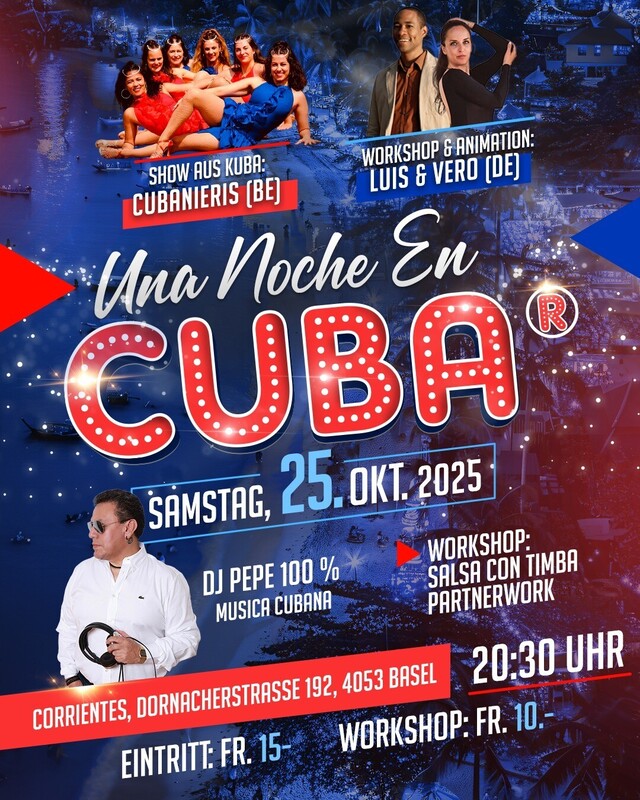 🇨🇺 UNA NOCHE EN CUBA® 🇨🇺 📅 Samstag, 25. Oktober 2025 | 🕣 ab 20:30 Uhr 📍 Corrientes, Dornacherstrasse 192, Basel 🔥 Hol dir das pure Karibik-Feeling nach Basel! Eine Nacht voller Timba, Son, Rumba & Cubatón – unsere Tanzfläche bebt mit den Rhythmen direkt aus Kuba. Spüre die Energie, tanze dich frei und lass dich mitreissen! 🎧 DJ Pepe (BS) – 26 Jahre Leidenschaft, Herzblut & kubanische Beats, wie man sie nur von ihm bekommt. ✨ Specials, die du nicht verpassen darfst: 💃 Salsa con Timba Partnerwork Workshop mit Vero & Luis (Freiburg) 🔥 Spektakuläre Show von Cubanieris (Bern), geleitet von Yanieri Martinez (Kuba) 👉 Eintritt Party: CHF 15.– | Workshop: CHF 10.– 💥 Pack deine Tanzschuhe ein – vamos a bailar! Wir sehen uns auf der Tanzfläche!