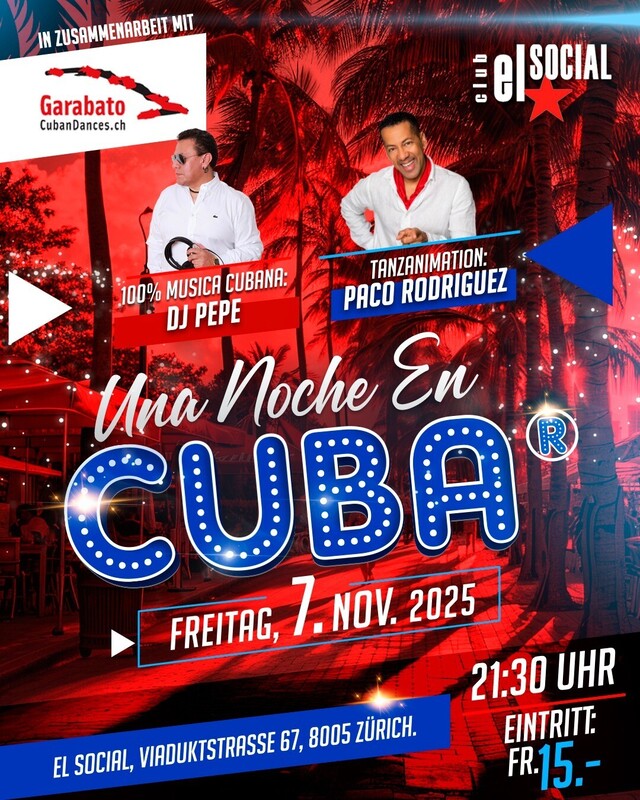 🇨🇺 Una Noche en Cuba® 🇨🇺 Freitag, 7. November 2025 ab 21:30 Uhr 🎶 100 % Música Cubana – pures Karibik-Feeling! 🇨🇺 Ob Timba, Son, Rumba oder Cubaton – unsere Tanzfläche bebt mit den heissesten Rhythmen direkt aus Kuba. Spürt die Energie, tanzt euch frei und lasst euch mitreissen! 🎧 DJ PEPE (BS) – 25 Jahre Leidenschaft am Pult Er ist eine feste Grösse der Schweizer Salsa-Szene: DJ Pepe bringt nicht nur Technik und Know-how mit, sondern auch Herzblut und tiefe Verbundenheit zur lateinamerikanischen Musik. Freut euch auf authentische kubanische Beats, wie man sie nur von ihm bekommt! 💃 Special Tanzanimation mit Paco Rodriguez 🇨🇺 Direkt aus Kuba und längst ein fester Bestandteil der Zürcher Tanzszene: Paco Rodriguez, Leiter der Tanzschule Garabato Cuban Dances, bringt euch mit seiner energiegeladenen Animation in Bewegung – und sorgt garantiert für Partystimmung im El Social! Vamos a bailar – wir sehen uns auf der Tanzfläche! 📍 Ort: El Social in Zürich 📍 Viaduktstrasse 67, 8005 Zürich Eintritt Party: Fr. 15.-