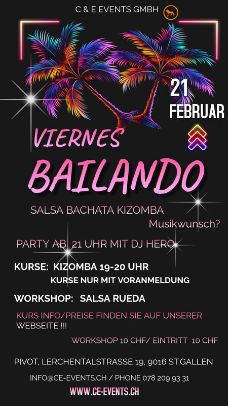 Lasst uns abtanzen und das Leben feiern am Freitag den 21. Februar im Pivot in St.Gallen!! Kizomba Kurs jeden Freitag von 19 - 20 Uhr Kurse nur mit Voranmeldung Workshop: Salsa Rueda von 20 - 21 Uhr Workshop 10 CHF / Party Eintritt 10 CHF Party ab 21.00 Uhr mit DJ Hero Anmeldung und Infos: Phone 078 209 93 31 oder per Mail an info@ce-events.ch Wir freuen uns auf einen schönen Abend mit Euch!