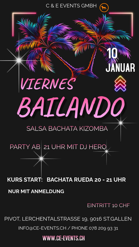 Lasst uns abtanzen und das Leben feiern am Freitag den 10. Januar im Pivot in St.Gallen!! Kizomba Kurs jeden Freitag von 19 - 20 Uhr Kurs Start: Bachata Rueda von 20 - 21 Uhr Kurs nur mit Anmeldung Party ab 21.00 Uhr mit DJ Hero Party Eintritt 10 CHF Anmeldung und Infos: Phone 078 209 93 31 oder per Mail an info@ce-events.ch Wir freuen uns auf einen schönen Abend mit Euch! https://ce-events.ch