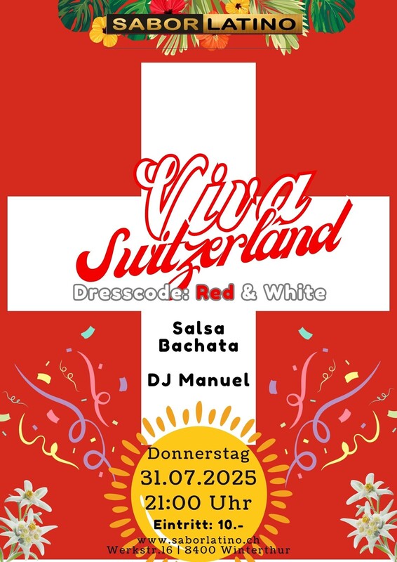 Let’s dance for Switzerland! Wir feiern den Nationalfeiertag am 31. Juli mit einer 🔥 Party im Sabor Latino! 🎶 DJ Manuel bringt euch mit Salsa & Bachata zum Schwitzen 🍹 Feine Cocktails an der Bar 👗 Dresscode: Rot & Weiss – zeigt eure Schweizer Farben! 📍 St. Gallerstrasse 133, Winterthur 🕘 Ab 21:00 Uhr Feiert mit uns in die Nacht! 💃🕺 #SaborLatino #SwissParty #SalsaParty #BachataNight #Nationalfeiertag #RotWeiss #DJManuel #Tanzparty #WinterthurTanzt https://saborlatino.ch/events/viva-switzerland/