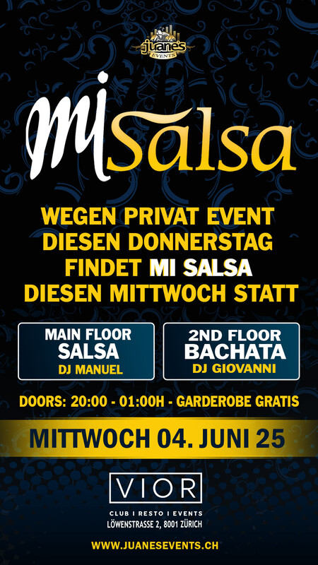 WEGEN EINER PRIVATEN VERANSTALTUNG AM DONNERSTAG, FINDET MI SALSA DIESEN MITTWOCH IM VIOR CLUB STATT. POR UN EVENTO PRIVADO EL JUEVES, MI SALSA SE HARA ESTE MIERCOLES EN VIOR CLUB. ► MI SALSA ◄ MANUEL & GIOVANNI (2 Floors) VIOR Club • MITTWOCH 04. JUNI 2025 •••• ► MAIN FLOOR: SALSA ALLSTYLES • DJ MANUEL • Salsa Allstyles - Cubana - Clasica - Puertorriqueña •••• ► 2ND FLOOR: BACHATA • DJ GIOVANNI • Bachata Moderna, Fusion, Clasica y del Recuerdo. •••• Gutschein im Wert von CHF 5.- für Dich für die Party am Samstag 07. Juni bei THE WHITE SALSA & BACHATA FEVER der AURA CLUB ZÜRICH •••• • 2 Grosse Tanzflächen • Grosse Salsa Floor • Grosse Bachata Floor • Doors: 20:00 bis 01:00 Uhr • Garderobe Gratis • Eintritt Party CHF 10.- Inkl. Garderobe •••• • EINTRITT: BEZAHLUNG AN DER KASSE NUR BARGELD. •••• Location: THE URBAN CLUB Löwenstrasse 2 8001 Zürich •••• SEARCH MAP https://map.search.ch/Z%C3%BCrich,L%C3%B6wenstr.2 •••• Bienvenidos Mi Salsa by Juanes Events https://juanesevents.ch/2-0-Events.html
