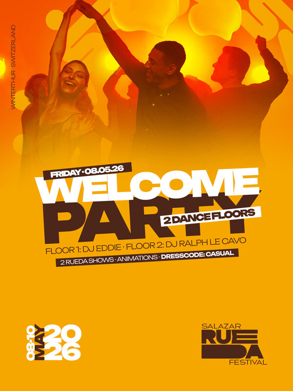 💥 WELCOME PARTY – SALAZAR RUEDA FESTIVAL 2026 Der perfekte Start in ein unvergessliches Festival-Wochenende! Wir öffnen die Türen zu einer Nacht voller Energie, Musik und Tanz. Freu dich auf 2 Dancefloors mit feinster Salsa & Bachata Musik und einer Atmosphäre, die dich sofort in Festivalstimmung bringt. Triff Tänzerinnen und Tänzer aus der ganzen Szene, knüpfe neue Kontakte und geniesse den ersten gemeinsamen Abend des Salazar Rueda Festivals. ✨ Highlights • 2 Dancefloors • DJ Eddie (Floor 1) • DJ Ralph Le Cavo (Floor 2) • 2 Rueda Shows • Animations • entspannter Dresscode: casual • perfekte Gelegenheit zum Ankommen & Einstimmen Ob du bereits Teil der Rueda Community bist oder einfach die besondere Stimmung erleben möchtest – diese Party ist der ideale Auftakt in ein Wochenende voller Tanz, Begegnungen und Lebensfreude. salazarruedafestival.com