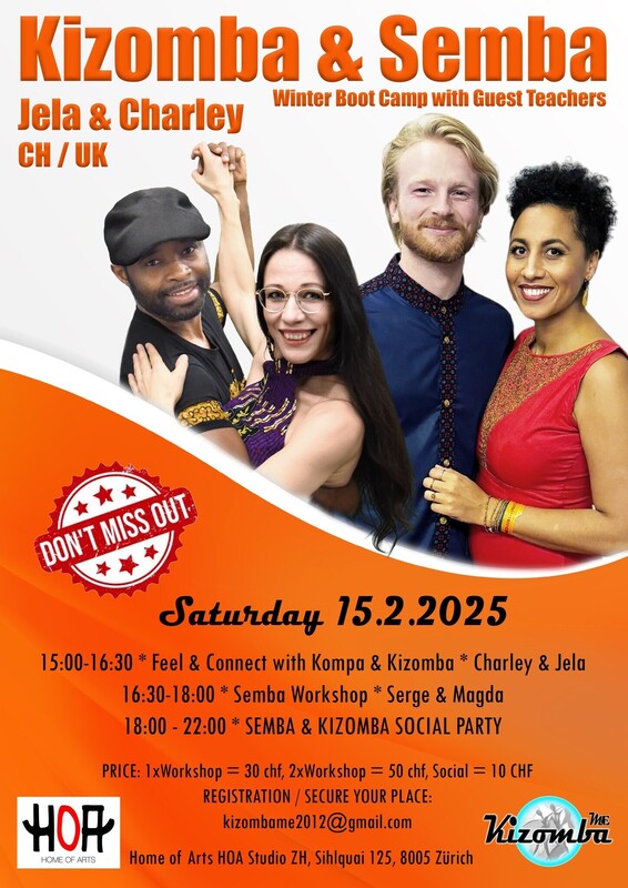 ♡ WINTER BOOTCAMP with guest teachers ♡ Charley (UK) & Jela (CH) 15.2.2025 15:00-16:30 Feel & Connect with Kompa & Kizomba - with Charley from London & Jela <3 16:30-18:00 Semba Workshop - with Serge & Magda 1x workshop = 30chf / 2x workshop = 50chf 18:00-22:00 SOCIAL PARTY - Semba & Kizomba 10chf Home of Arts HOA Studio ZH Sihlquai 125, 8005 Zürich please register now to secure your place - limited capacity: kizombame2012@gmail.com We are looking forward to all of you! https://www.facebook.com/events/587298230935269