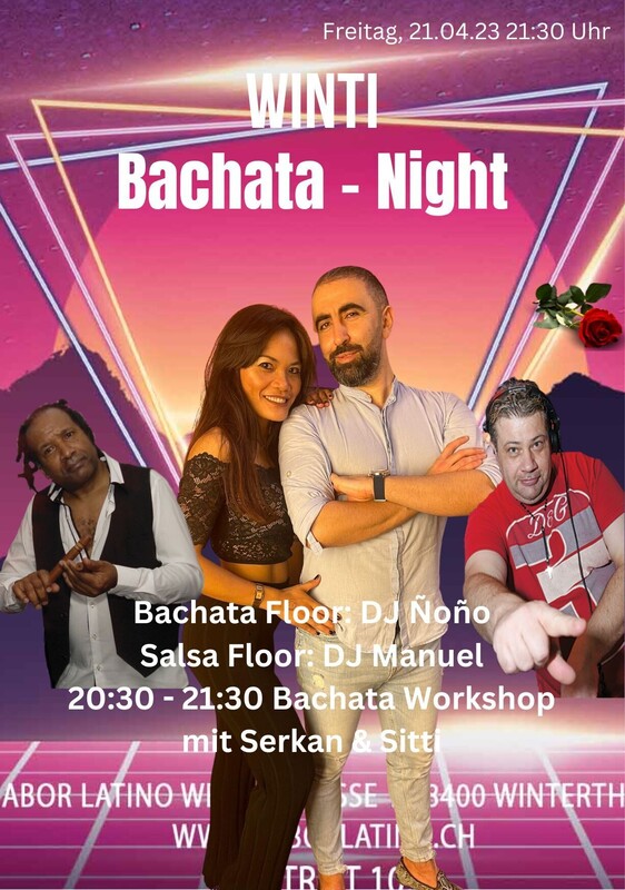 Winti Bachata Night, An der Winti Bachata Night kommen alle Tanzbegeisterten auf ihre Kosten: Bachata-Liebhaber können ihre Leidenschaft mit Bachata, Fusion und Sensual auf dem Haupttanzfloor ausleben. Doch auch Salsa- und Kizomba-Fans kommen auf dem zweiten Tanzfloor voll auf ihre Kosten. Feiere mit uns eine Nacht voller Leidenschaft, Tanz und Musik! Floor 1: DJ Ñoño: 100 % Bachata Floor 2: DJ Manuel Salsa https://www.facebook.com/sittimohammad.solefordance.5 20:30 - 21:30 Uhr Bachata Workshop mit Serkan und Sitti Weitere Infos zur Winti Bachata Night Parken ist kein Problem: Vor dem Tanzclub Sabor Latino gibt es ausreichend kostenlose Parkplätze. Mit öffentlichen Verkehrsmitteln und Nachtbussen ist die Anreise zum und vom Sabor Latino bequem und unkompliziert. Free Parking vor dem Club Im Sabor Latino gibt es auch eine Tanzschule: www.bailemos.ch