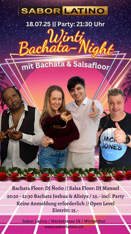 Winti Bachata Night auf 2 Dancefloors + Workshops mit der Schweizermeisterin Erlebe die Winti Bachata Night – die Party, bei der alle Tanzbegeisterten auf ihre Kosten kommen! Auf dem Hauptfloor dreht sich alles um Bachata: von klassisch bis Sensual und Fusion kannst du deine Leidenschaft voll ausleben. Auf dem zweiten Floor erwartet dich heiße Salsa mit DJ Manuel – auch Kizomba-Fans sind herzlich willkommen! Feiere mit uns eine Nacht voller Leidenschaft, Musik und Tanz – in bester Gesellschaft. Floors: Floor 1: DJ Ñoño – 100 % Bachata Floor 2: DJ Manuel – Salsa Workshop-Highlight: 20:30 – 21:30 Uhr Bachata Workshop mit Joshua & Alisiya – Alisiya, frisch gekürte Bachata Schweizermeisterin 2025, zeigt dir gemeinsam mit Joshua elegante Moves, Styling und Technik. Workshop + Party: 25.– CHF / Nur Party 15.- ➡️ Anmeldung: bailemos.ch/bachata-workshop/ www.saborlatino.ch