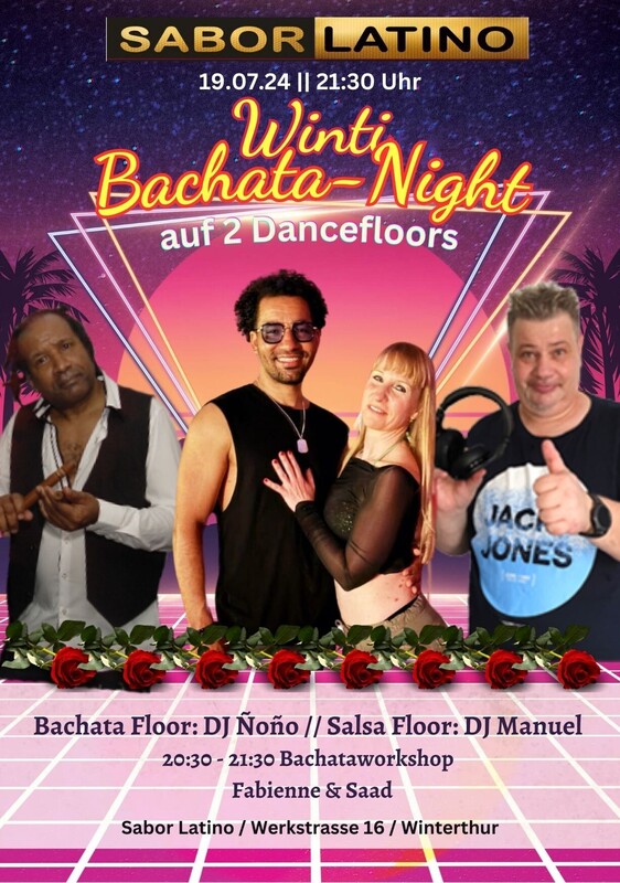 Winti Bachata Night An dieser Party kommen alle Tanzbegeisterten auf ihre Kosten: Bachata-Liebhaber können ihre Leidenschaft mit Bachata, Fusion und Sensual auf dem Haupttanzfloor ausleben. Doch auch Salsa- und Kizomba-Fans kommen auf dem zweiten Tanzfloor voll auf ihre Kosten. Feiere mit uns eine Nacht voller Leidenschaft, Tanz und Musik! Floor 1: DJ Ñoño 100 % Bachata Floor 2: DJ Manuel Salsa 20:30 -21:30 Bachata Workshop mit Saad & Fabienne (WS + Party 25.-) ohne Anmeldung Eintritt ohne WS 15.- https://saborlatino.ch/events/winti-bachata-night-auf-2-dancefloors-19-04-24/