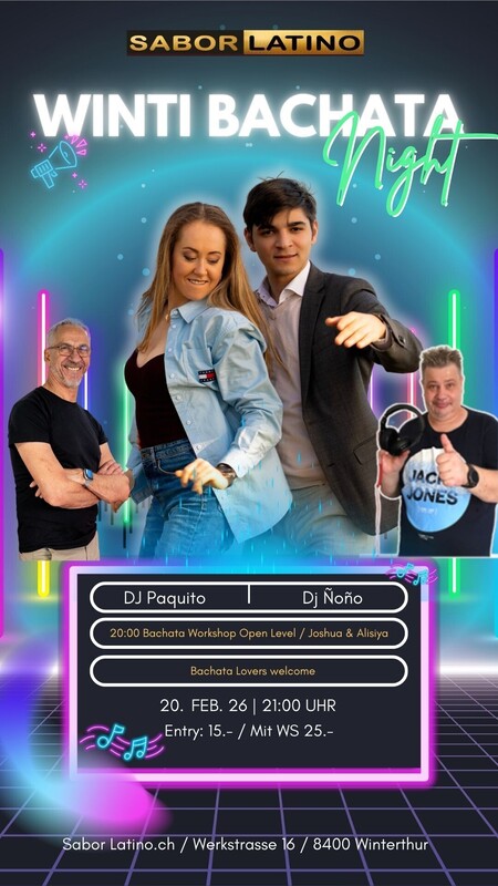 Winti Bachata Night – Salsa & Bachata im Sabor Latino Feel the groove. Feel the connection. 💫 Die Winti Bachata Night ist der Treffpunkt für alle Latin-Dance-Liebhaber:innen in Winterthur und Umgebung – ein Abend voller Musik, Gefühl und Club-Vibes im Sabor Latino. Die Party findet auf zwei Dancefloors statt: 🕺 Salsa Floor für alle, die klassische & moderne Salsa lieben 💃 Bachata Floor für pure Emotion, Flow und Connection So kannst du den ganzen Abend genau das tanzen, worauf du gerade Lust hast – oder einfach zwischen den Floors wechseln. Vor der Party startet der Abend um 20:00 Uhr mit einem Bachata Workshop (Open Level) mit Joshua & Leandra. Ideal zum Aufwärmen, Technik verbessern und um mit noch mehr Gefühl in die Party zu starten. Ab 21:00 Uhr gehört das Parkett ganz dir – mit fein selektierter Musik, entspannter Atmosphäre und einer offenen, tanzbegeisterten Community. Was dich erwartet: 🎶 Zwei Dancefloors: Bachata: DJ Ñoño Salsa: DJ Paquito 💃🕺 Bachata Workshop ab 20:00 Uhr mit Joshua & Alisiya ✨ Schweizermeisterin Bachata live im Workshop 🍹 Bar, Garderobe & echte Club-Vibes 🕘 Party ab 21:00 Uhr Ob du zum Lernen kommst, zum Tanzen oder einfach zum Geniessen – Winti Bachata Night verbindet Musik, Bewegung und Leidenschaft. Workshop + Party: 25.– CHF ➡️ Anmeldung: bailemos.ch/bachata-workshop/ Nur Party: 15.- https://saborlatino.ch/events/winti-bachata-night-mit-bachata-workshop/