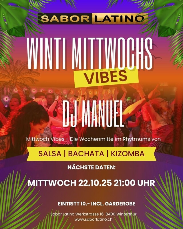 Winti Mittwoch Vibes – die neue Party in Winterthur! Feier die Wochenmitte tanzend im Sabor Latino – mit heissen Rhythmen aus Salsa, Bachata und Kizomba. So fühlt sich Mittwoch richtig gut an! Salsa, Bachata, Kizomba mit DJ Manuel Gratis Parkplätze vor der Tür https://saborlatino.ch/events/winti-mittwochs-vibes/