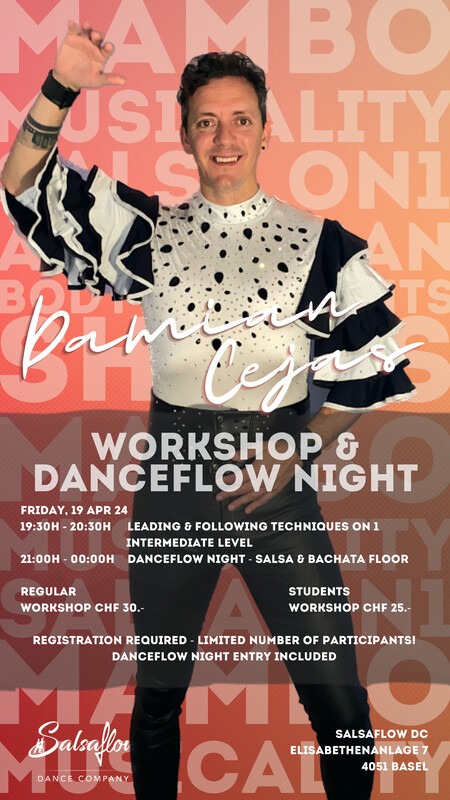 Kommt zu unserer Danceflow Night, in welcher ihr in lockerer Atmosphäre Freunde treffen und miteinander tanzen und üben könnt. Ob Salsa, Bachata, Cha Cha oder eine Rueda Cubana, es ist für jeden etwas dabei! Lass Dich von DJ Rafa Rivas auf dem Salsa Floor überraschen. Für den Bachata Floor haben wir eine Playlist, erstellt von unseren Bachateras, welche jede Woche überarbeitet wird. Ihr dürft auch gerne vor Ort eure wünsche anbringen! :) Jeden dritten Freitag im Monat findet noch ein spezieller Workshop statt - mehr Infos auf unserer Website. Workshop: Leading & Following Techniques On1, Intermediate mit Damian Cejas Preis? Worskhop Regulär CHF 30.- / Studenten CHF 25.- (Danceflow Night Eintritt inklusive) Nur Danceflow Night: Salsaflow Schüler CHF 5.- Externe CHF 10.- 21:00h - 00:00h / 2 Floors (Salsa mit DJ Rafa & Bachata) https://www.salsaflow-dc.com/kurse/workshops/