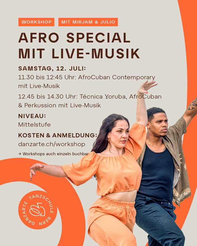 Workshop Técnica Yourba, AfroCuban & Perkussion mit Live Musik Reise mit uns bis zum Ursprung der folklorischen Tänze. Erfahre, wie die Kolonialisierung, die Sklaverei und die Yoruba-Kultur mit ihren Gottheiten – den Orishas – den Tanz in Kuba geprägt hat. Gemeinsam entdecken wir einzigartige Bewegungen. Wir freuen uns auf dich, Dein Danzarte Team. https://danzarte.ch/workshop/