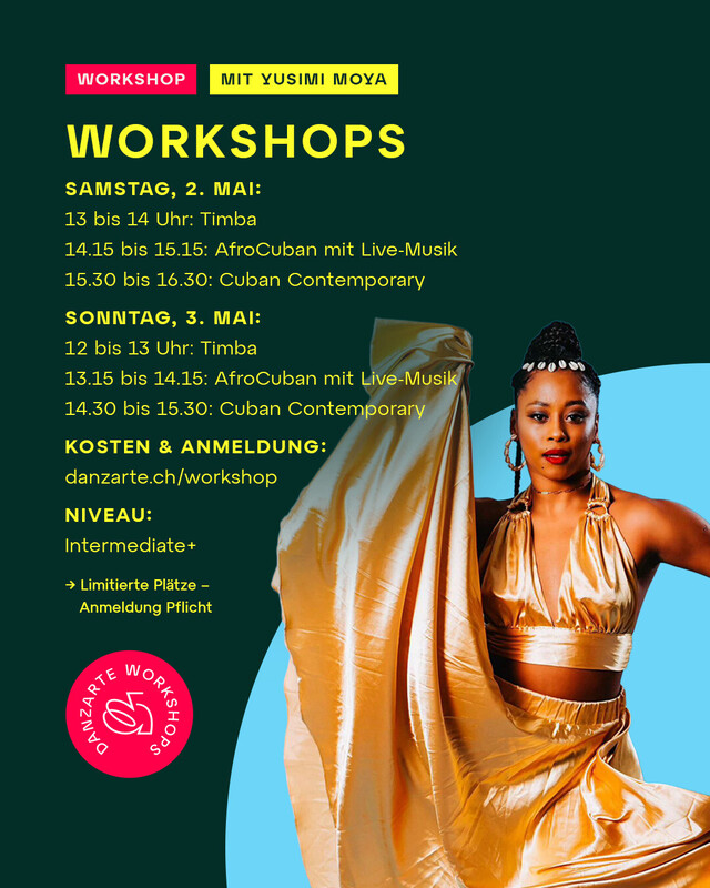 Erlebe ein intensives Workshop-Wochenende mit Yusimi Moya und tauche ein in verschiedene Facetten kubanischer Tanzkultur. Von energiegeladener Timba über ausdrucksstarken AfroCuban mit Live-Musik bis hin zu Cuban Contemporary erwartet dich ein vielseitiges Training voller Rhythmus, Dynamik und Ausdruck. Die Workshops bieten dir die Möglichkeit, dich tänzerisch weiterzuentwickeln, neue Impulse zu sammeln und dich ganz auf Musik und Bewegung einzulassen. Level: Intermediate+ https://danzarte.ch/salsa-workshops-in-bern/