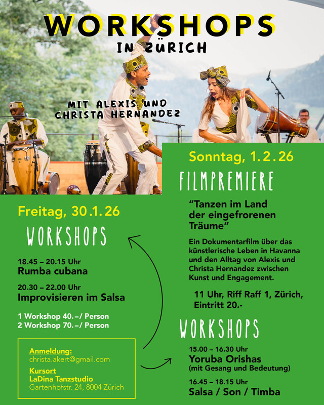 Special Workshops mit Alexis und Christa Hernandez Alexis und Christa Hernández, sind für die Premiere unseres Dokumentarfilms „Tanzen im Land der eingefrorenen Träume“ in der Schweiz. Im Rahmen dieser besonderen Veranstaltung bieten wir Workshops in Zürich an. Tauche mit uns in die Welt der afrokubanischen Tänze ein und lasse deine Salsa davon inspirieren. - Freitag 30. Januar 26 - 18.45 - 20.15 Rumba Cubana 20.30 - 22.00 Improvisation im Salsa - Sonntag 1. Februar 26 - 15.00 - 16.30 Yoruba Orishas 16.45 - 18.15 Salsa / Son / Timba https://doodle.com/sign-up-sheet/participate/0e7d69ac-a1ee-434d-93f9-338e6c96279f/select