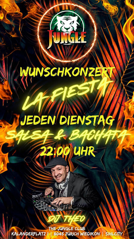 WUNSCHKONZERT★ Ein neues Salsa & Partykonzept in Zürich ★ JEDEN DIENSTAG mit DJ Theo >>> ab Dienstag 29. April <<<> Jeden DIENSTAG in Zürich << Ein neues Partykonzept, das bei Salsa & Bachata Tänzern in anderen Ländern bereits sehr beliebt ist. Bei einem Wunschkonzert darf sich das Publikum über Whatsapp die Salsa & Bachata Lieder wünschen, die die DJ`s gespielt werden sollen. - Türöffnung 21.30h. - Eintritt Party 10.- Inkl. Welcome Drink - 21:30 Party auf 300 m2 Tanzparkett - Garderobe Gratis - Parkhaus Sihlcity mit 850 Parkplätze - Bahnhof Sihlcity: Saalsporthalle - Anfahrt mit dem Auto: https://sihlcity.ch/de/anfahrt-mit-dem-auto === THE JUNGLE CLUB === Kalanderplatz 1, 8045 Zürich Wir freuen uns sehr auf Dich! https://fb.me/e/5rPyrwtNu www.thejungleclub.ch