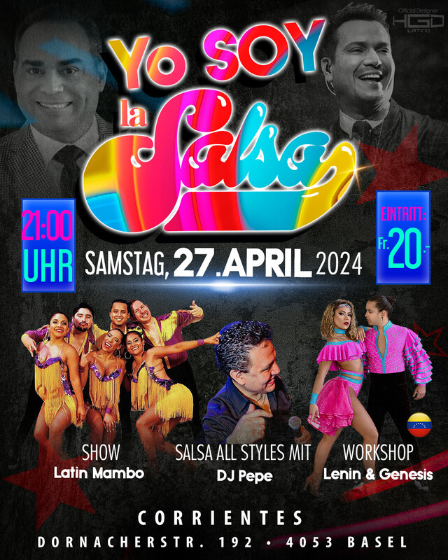 YO SOY LA SALSA! Basler Edition Samstag, 27. April 2024 Wir freuen uns auf eine tolle Party mit internationalen Salsastars aus Venezuela/Deutschland. Workshop mit Genesis Solorzano & Lenin Lopez, Salsa- und Mambostars aus Venezuela. Um ca. 00:00 begrüssen wir LATIN MAMBO by Genesis & Lenin mit einer energiegeladenen Show. Türöffnung: 21:00 Uhr Eintritt: Fr. 20.- Corrientes Dornacherstrasse 192 4053 Basel