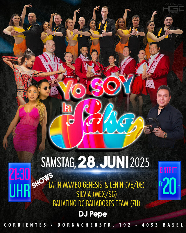 YO SOY LA SALSA! – Basler Edition 📆 Samstag, 28. Juni 2025 📍 Corrientes, Dornacherstrasse 192, 4053 Basel 🎟️ Eintritt: CHF 20.– 🕤 Türöffnung: 21:30 Uhr 🎉 Erlebe eine Nacht voller Salsa-Leidenschaft mitten in Basel! Ein einzigartiger Event für alle Liebhaber des Salsa ON2, Mambo, Linientanz – mit einem Hauch Kuba und etwas Bachata-Flair. ✨ Shows mit nationalen Salsa-Stars aus der Schweiz und Deutschland: – Latin Mambo Genesis & Lenin (Venezuela / Karlsruhe) – Bailatino DC Bailadores Team (Zürich) – Silvia (Mexiko / St. Gallen) 🎧 Musik von DJ Pepe – eine feste Grösse der Schweizer Salsa-Szene Seit 25 Jahren bringt DJ Pepe authentischen Salsa-Sound mit technischem Know-how, tiefem musikalischem Gespür und viel Herz auf jede Bühne – national und international. Freu dich auf einen mitreissenden Mix aus Salsa Clasica, Mambo, ein bisschen Cubano und fein dosierter Bachata. 📍 Corrientes Dornacherstrasse 192 4053 Basel