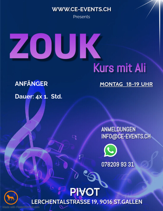 Wir starten unseren Brasilien Zouk Kurs mit Ali jeden Montag Dauer: 4 Wochen Zeit : 19 - 20 Uhr Ort: Pivot , St. Gallen Kurs Kosten: 4x 1 Std. CHF 100.-- Anmeldung: unter 078 209 93 31 oder per mail: info@ce-events.ch Zielgruppe: Anfänger ohne oder mit Vorkenntnissen. Einzel oder paar Anmeldungen möglich, bitte genug früh anmelden, damit wir die Balance, Leader, Follower in einem akzeptablen Rahmen halten können. Der Kurs findet ab 4 Teilnehmern statt. Zouk Hug 🫂 Wir freuen uns auf schöne Kursabende mit euch! https://ce-events.ch