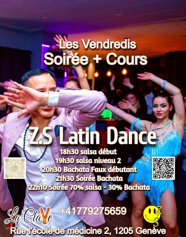 Grand Événement de Clôture de l'Année - Célébrons la Passion de la Danse. L’École de Danse Z.S Latin Danse est heureuse de vous inviter à un événement exceptionnel pour clôturer cette année en beauté, avec rythme et joie. Une soirée pleine d’énergie, de musique et de danse, où nos élèves auront l’opportunité de montrer tout ce qu’ils ont appris pendant 3 mois . Et bien sûr, tout le monde est invité à partager cette soirée inoubliable et élégante! Programme de la Soirée : 18h30 – 19h30 | Salsa Débutants : La soirée commence avec un cours pour nos élèves débutants en salsa. Un moment idéal pour découvrir les bases de la salsa et voir les premiers pas des nouveaux danseurs sur scène ! 19h30 – 20h30 | Salsa Niveau 3 : Un cours de mouvements plus complexes et stylisés, montrant l’évolution de nos danseurs. 20h30 – 21h30 | Bachata Niveau 2 et 3 : Un cours qui allient technique, sensualité et émotion. Des mouvements fluides aux figures plus complexes 21h30 – 22h10 | Bachata Social 100% : C’est l’heure de la danse sociale ! Un espace où tous les participants peuvent se mélanger et danser la bachata sans interruption. La piste sera remplie de sourires, de complicité et bien sûr, de beaucoup de bachata ! 22h10 – 23h00 | Soirée Sociale 70% Salsa – 30% Bachata : Nous clôturons la soirée avec une fiesta sociale de salsa et bachata, où vous pourrez profiter d’un mélange parfait des deux styles. 70% salsa et 30% bachata, pour que chacun puisse danser, socialiser et finir l’année de la meilleure des façons ! Cet événement est conçu pour que nos élèves puissent montrer leurs progrès en danse, mais aussi pour que tout le monde puisse partager une soirée pleine de rythme, de plaisir et de convivialité. Ne manquez pas l’opportunité de célébrer la fin de l’année avec nous ! prix: 1 heure de cours 20chf, 1 mois 80chf, 3 mois 220chf (salsa ou bachata) 1 mois (salsa et bachata) 140chf , 3 mois(salsa et bachata) 400chf Entrée libre.... À ne pas manquer ! « Ressentez la musique et libérez-vous ».