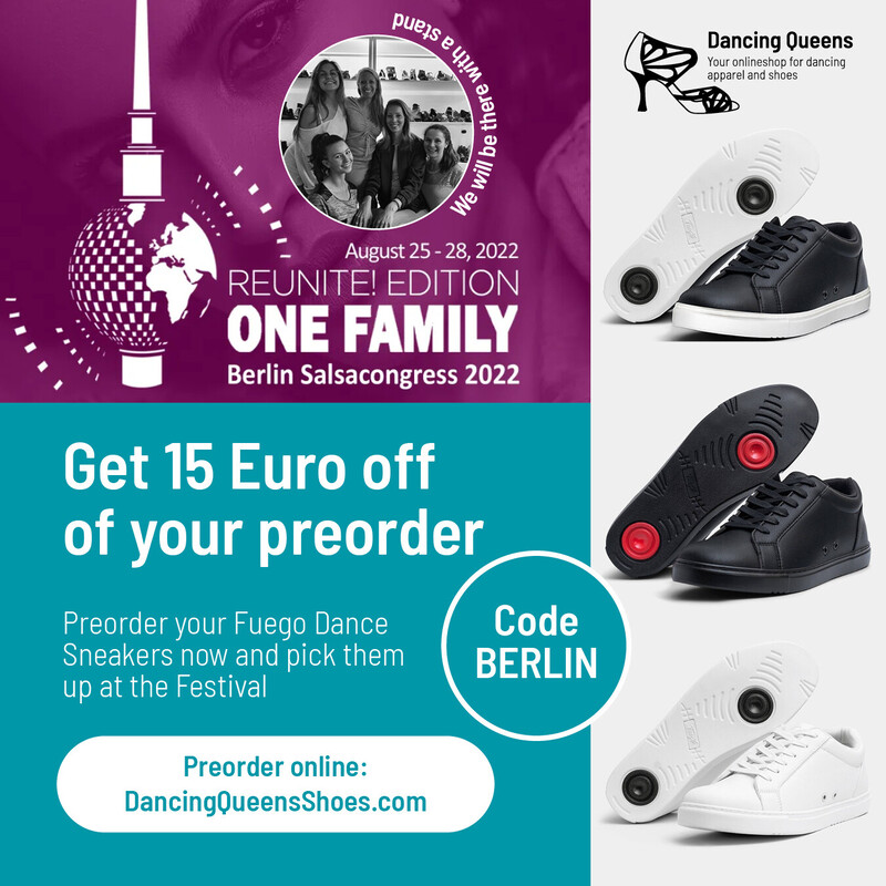 Das Salsa Festival in Berlin steht bald vor der Türe (25. bis 28. August). Wir von Dancing Queens sind mit einem Stand voller Fuego Dance Sneakers vor Ort. Diese einzigartigen Dance Sneakers sind zurzeit in der EU nur bei uns erhältlich!