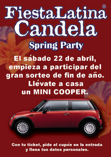 Además puedes ganarte un nuevo Super MINI COOPER del año, que te regala Fiesta Latina Candela, reclamando en la entrada un cupón gratis. Rellénalo con tus datos personales y tendrás la posibilidad de llevarte a casa este Auto MINI COOPER.