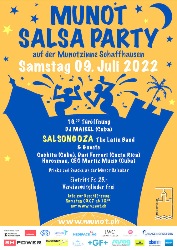 Hallo liebe Salsongoceros und Salsongoceras! Die grosse MUNOT SALSA PARTY in Schaffhausen findet dieses Jahr am Samstag, den 09. Juli 2022 statt! 19:00 - 24:00, Kommt frühzeitig, um an der Abendkasse ein Ticket zu erhalten! Türöffnung 19:00 Uhr. Eintritt Fr. 25.—. Aktuelle Infos auf www. munot.ch.