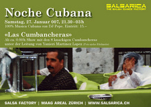 Nach der umwerfenden ersten Noche Cubana vom 11.11.2006 folgt nun der zweite Streich! Am Samstag 27. Januar steigt die erste Noche Cubana im 2007! Auch dieses Mal natürlich mit 100% Musica Cubana von Los Van Van, Charanga Habanera, Pachito Alonso, Elio Reve, Manolito y su Trabuco, NG La Banda, Dan Den, Issac Delgado, Maraca, Bamboleo, Yumuri, etc und erfrieschenden Mojitos