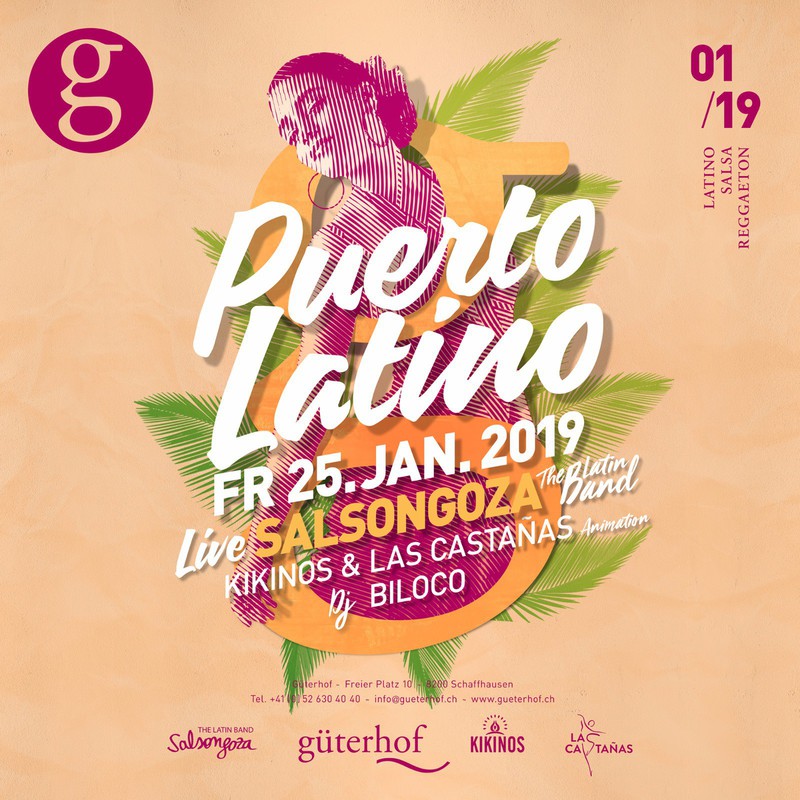 Vor dem grossen Februarloch wollen wir nochmals richtig durchstarten und den alten Parkettboden im Güterhof durchtanzen und zwar an der ersten PUERTO LATINO PARTY im neuen Jahr, mit SALSONGOZA, The Latin Band, DJ BILOCO und Tanzanimation mit den Gruppen KIKINOS und CASTANÂS