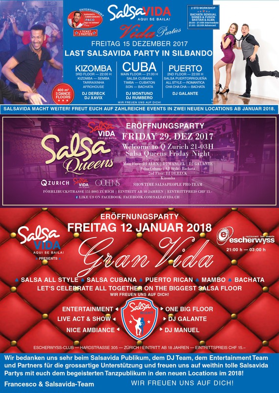 Las exitosas fiestas de Salsavida tendrán lugar temporalmente en el Club Escherwyss los viernes 1 y 3 del mes con la misma calidad de DJs, entretenimiento y espectáculos. Nos gustaría agradecer a los bailarines de Salsavida, los invitados, el equipo de DJ, el equipo de entretenimiento y los socios por su gran apoyo y esperamos con interés las grandes fiestas de Salsavida con usted la apasionada comunidad de baile en los nuevos lugares en 2018!