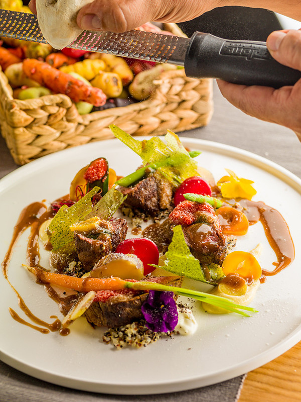 (Hochland-Kartoffeln aus 3500 Metern Höhe) und saisonalem Gemüse garniert