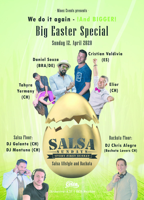 Und bald ist es wieder so weit - am Ostersonntag 12. April 2020 verwandelt sich der Evita Club im Zürcher Oberland zum Salsa und Bachata Treffpunkt für Social Dance Liebhaber und wir feiern zusammen DIE SONNTAGS SALSA UND BACHATA PARTY DES JAHRES!